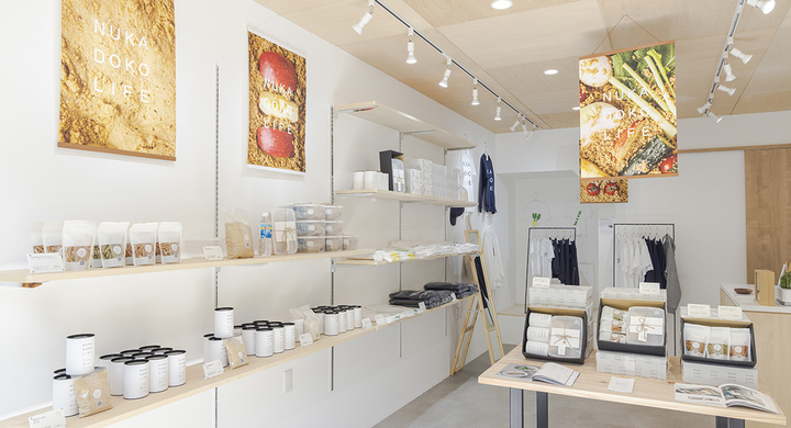NUKADOKO LIFE では、届いたその日からすぐに漬けられる「旨味たっぷり味調整済み熟成のぬか床」「天然水(軟水)」「容器」のセット(¥ 3,000)を販売しています。熟成済みなので、野菜の切れ端を入れて発酵を促す捨て漬けが不要。初めての方でも簡単に美味しく漬けることができます。また、契約農家の米ぬかを使用した「KOMENUKA かりんとう」(¥ 500)や、ぬか床の熟成状態のpHの説明を記載しデザインしたスウェット、Tシャツ、キャップなども販売しています。