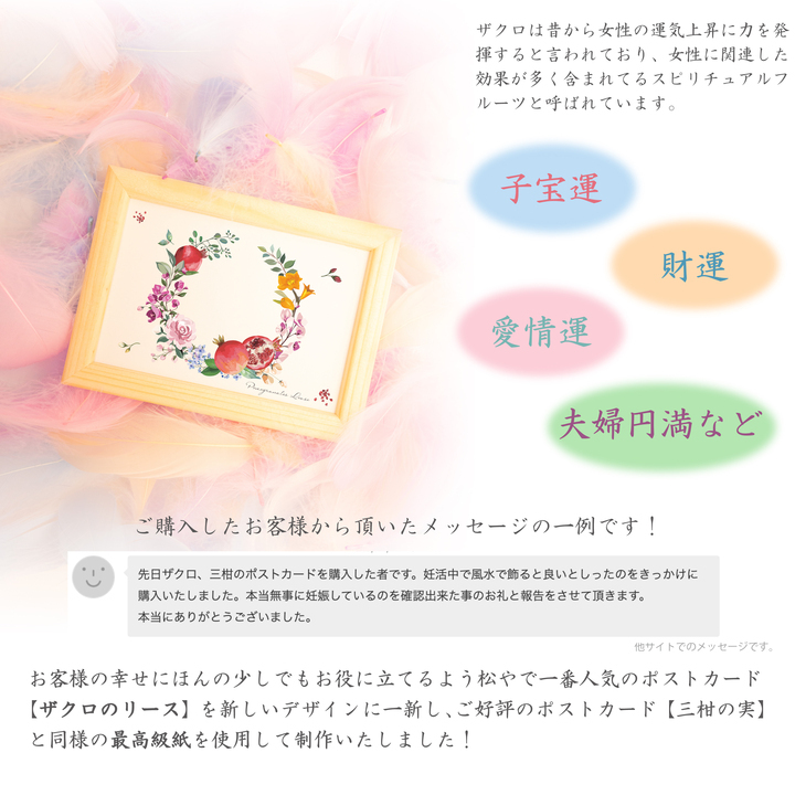 妊活中の方に人気上昇中のインテリア「ザクロのリース」や仕事運や健康運、恋愛運に効果があると言われている「三柑の実」などを販売中! 一番人気はオリジナルポストカード「ザクロのリース」です!妊活中の女性に人気が高く、実際に子宝に恵まれたというご報告も頂いております! ご自宅用、プレゼント用にちょうどいいハガキサイズです!