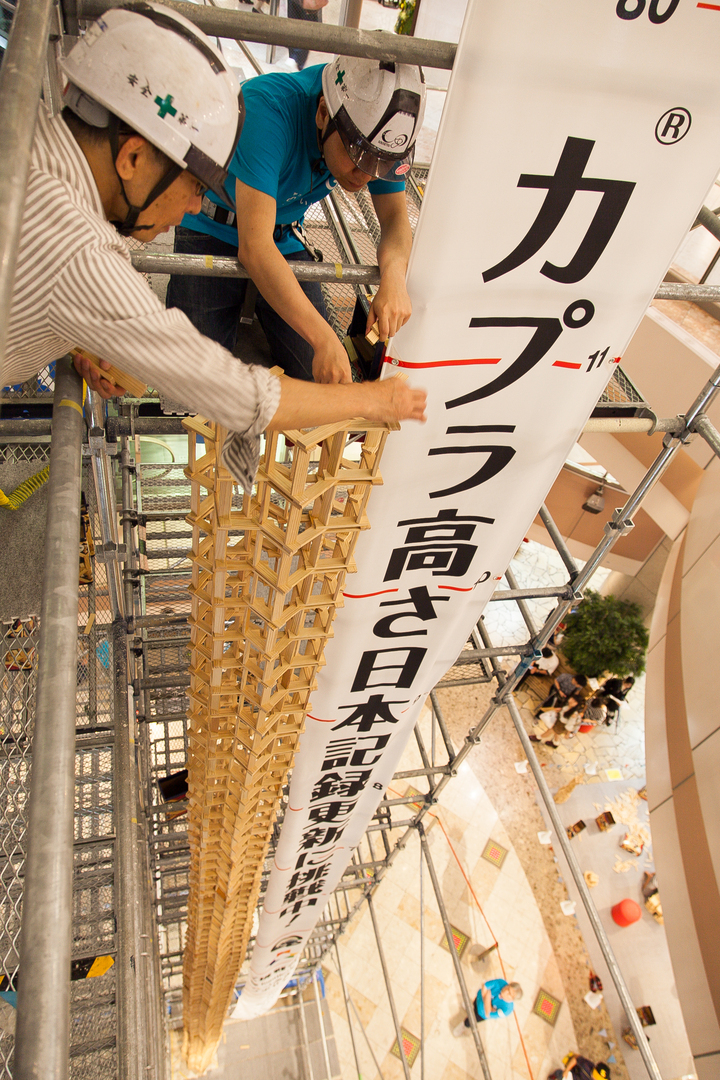 ・初日には、公募から選ばれた親子20組40名と共に高さを積み上げていきます