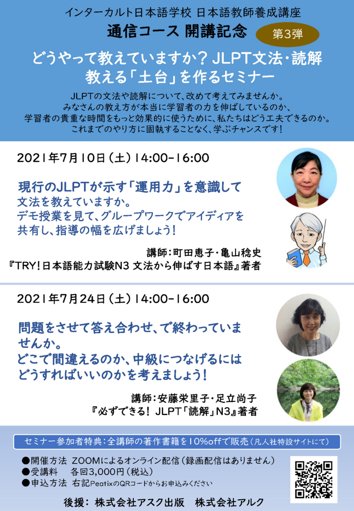 インターカルト日本語学校 日本語教師養成講座 通信コース開講記念短期講座 第三弾 『どうやって教えていますか? JLPT文法・読解  教える土台を作るセミナー』