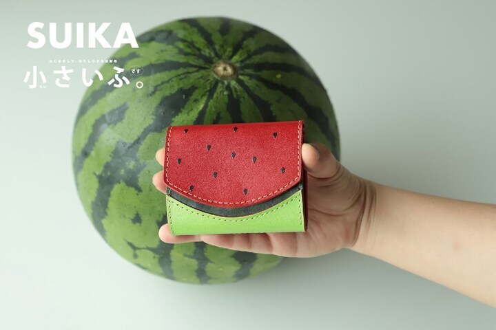 はじまりは株式会社ロッテアイスが製造するスイカバー愛の強すぎる女性スタッフ野村知佳(ノムラ チカ)が個人的な趣味でつくったミニ財布、素材には日本最高峰と言われる栃木レザー社のヌメ革を100%使った本格仕様。