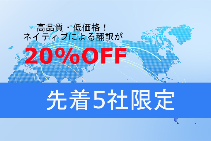 期間中、お申込みをいただいた先着5社様に限り、ネイティブによる翻訳サービスが、通常価格より20%OFFとなります。