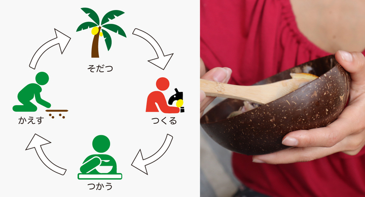 ココナッツ殻の形状を活かしながら切削加工で作られているため、金型を使って作られたプラスチック樹脂製の器と比べ、生産時に発生するCO2の排出量も大幅に抑えることができています。一つ一つ形状や柄が異なるのも自然の恵みを感じさせる特徴となっています。是非、手に取って自然の恵みを感じてみて下さい。