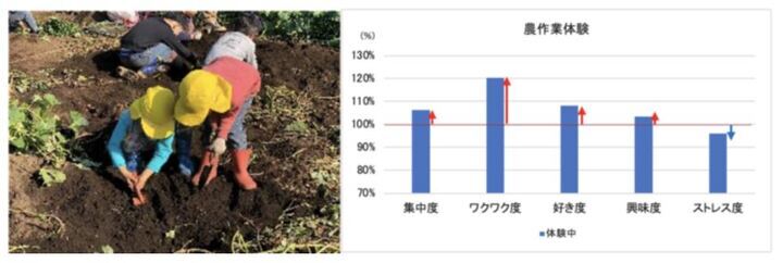 2.農作業体験中のワクワク度の向上度合いは大きく、集中度、好き度、興味度、ストレス度にも動きがみられており、より感性が動き情動に影響をする可能性があります。