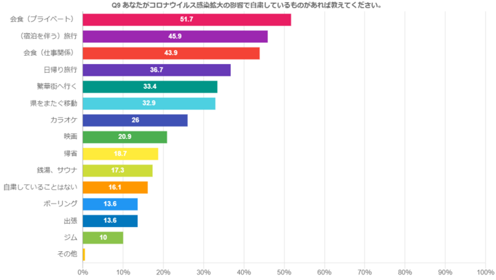 コロナウイルス感染拡大の影響で自粛しているものについて聞いたところ、『会食(プライベート)(51.7%)』が最も多く、『(宿泊を伴う)旅行(45.9%)』、『会食(仕事関係)(43.9%)』『日帰り旅行(36.7%)』『繁華街へ行く(33.4%)』との結果となり、昨年実施した同様の調査と比べるとすべての項目で10%程度減少している結果となりました。