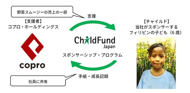 スムージーの売上は当社の社会貢献活動の1つとして、アジアを中心に貧困の中で暮らす子どもたちや家庭・地域を継続的に支援するプログラムを展開する、特定非営利活動法人チャイルド・ファンド・ジャパン(東京都杉並区)に寄付します。同法人のスポンサーシップ・プログラムは、貧困の中で暮らす子どもの健やかな成長を継続的に支援するもので、子どもとの手紙のやりとりや成長記録を通して、成長を見守りながら「里親的」に支援できることが特長です。当社はこのプログラムに8月から寄付を開始。子どもからの手紙や成長記録は社内報などで社員に共有します。当社はこの取り組みにより、社員自身の意思で始められる(自律参加型の)社会貢献活動に取り組み、社員が支援先とのやり取りを通じて社会貢献意識・意欲を醸成するとともに、支援先からの感謝を感じられる幸福感を得ることがメリットとなります。