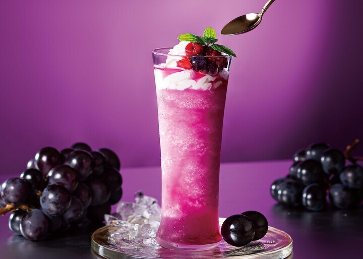 「山梨ピオーネグラニータ」は、山梨県産ピオーネの爽快な香りとしっかりした果汁感をお楽しみいただけるフローズンドリンクです。仕上げにホイップ、3種のベリー、ミントをトッピング。