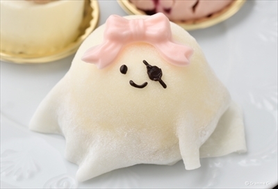 香ばしいアーモンダイスやサクサク食感のフィヤンティーヌ、チョコレートを忍ばせた食いしん坊オバケちゃんは、もちもちの求肥に包まれた柔らかボディを解剖するとバニラムースの中からピスタチオ&ベリーのソースがとろ~り。眼帯をつけたニヒルな笑顔がなんともダーク。