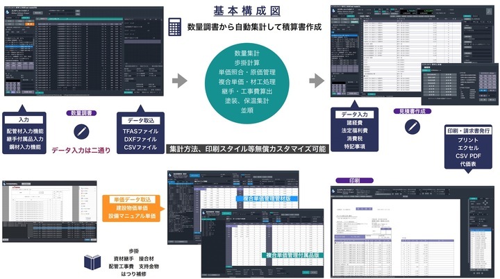 数量調書(拾い出し)からの自動集計、歩掛計算、複合単価管理に対応した、配管工事用の積算・見積書を作成するソフトです。