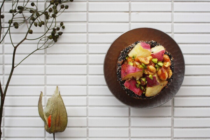 飾りにはキャラメリゼしたくるみと、バターソテーした金時芋を。