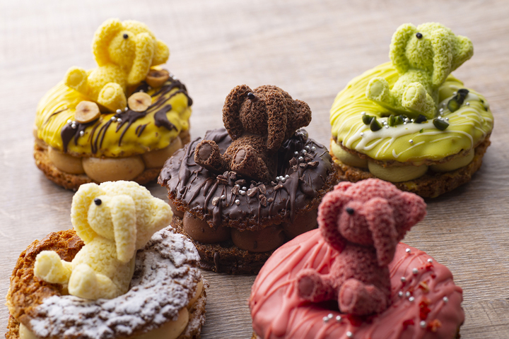 ふんわりとした生地が特徴のバターたっぷり自家製ブリオッシュに、お花を持ったくまのショコラをのせた「クマトッツォ」や、リング状に絞ったシュー生地にたっぷりのクリームを挟んだパリ・ブレストに、おめめを隠したくまのショコラをのせた「BEARS〜ベアーズ〜」。