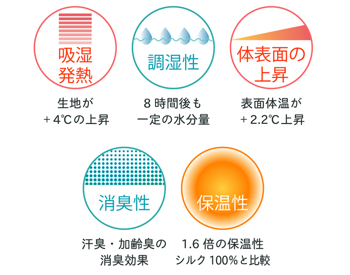 ・吸湿発熱の効果が高いカシミヤと、調湿性・消臭性が高いシルクを組み合わせてインナーに適した糸を開発しました。さらにストレッチ糸を芯にする撚糸技術 で、肌に触れるところは100%カシミヤシルクというミラクルを実現しました。