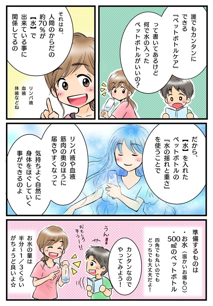 体内の水分とペットボトルなどの水の揺らぎをシンクロさせて心身をケアする「ペットボトルケア」の紹介マンガ小冊子出版のクラウドファンディングプロジェクトを10月6日(水)に開始しました。日々頑張る全国のお母さんなどを癒すため確立したケア方法を多くの方に知っていただき、自宅などで実践できるよう、プロジェクトのページでもケア方法を学べる内容をお伝えしています。