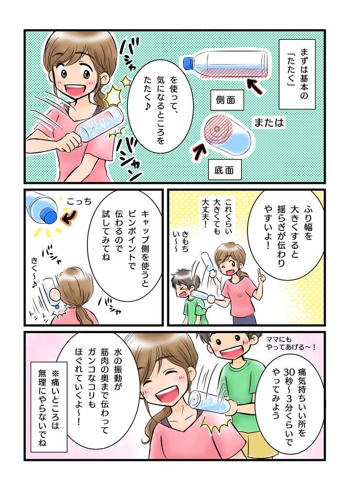 身近にあるペットボトルなどに水を入れて叩いたり、さすったり、挟んだりするだけでお金をかけずにケアをすることができます。初めての方は、分かりやすい基本のケア方法である「叩く」からお試しください。