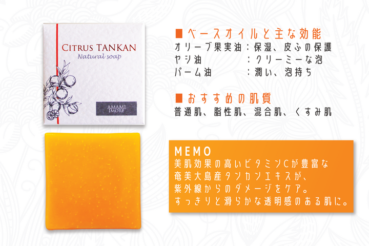 日本の鹿児島県奄美大島(宇検村)の「たんかん果汁」を使用したナチュラルソープです。たんかんとは、ポンカンとネーブルオレンジの自然交配種でできた柑橘類です。ただ甘いだけでなく酸味があるのが特徴です。