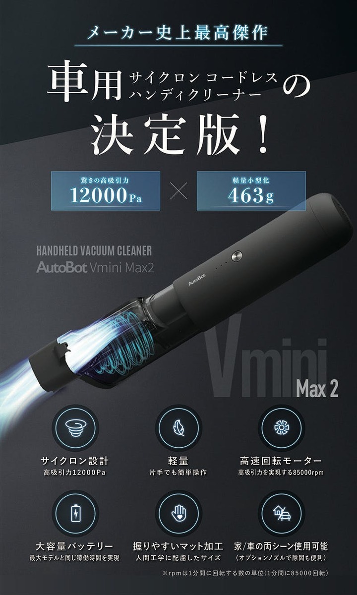 12000Paの高吸引力はそのままに、500g以下の軽量ボディながら、バッテリー長持ちの本格的サイクロン設計のクリーナーです。