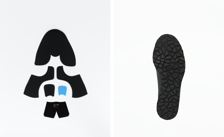 外観は革靴を意識していますが、履き心地に直結する内部はスニーカー的な設計をしています。シュータンには足甲への負担を軽減するためスポンジを、スベリ(カカト部)にはマイクロストッパー素材を使用し、カカトのホールド感を上昇させています。アウトソールには、高いグリップ性・耐久性を誇りイレギュラーパターンがオールコンディションに適応するドイツ hexa4GRIP社 を採用。