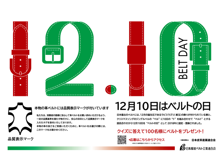 またベルトの日(12月10日)は、奈良の正倉院に収蔵されている日本最古のベルトの本体に紺玉の飾りが付けられており、紺玉は12月の誕生石のラピスラズリのことなので12月。12月に流れるクリスマスソングの「ジングルベル」の「ベル」に、10日の「ト」を組み合わせて「ベルト」とする語呂合わせから。実用性、ファッション性、そしてギフト製品としても需要の高いベルトの良さをアピールすることが目的。記念日は2018年(平成30年)に一般社団法人・日本記念日協会により認定・登録されました。