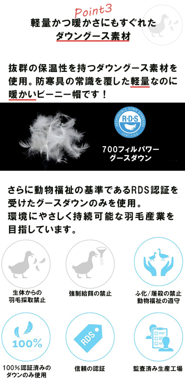 3.ダウン(羽毛)の使用に関する認証「RDS(Responsible Down Standard)」を取得している素材のみを使用