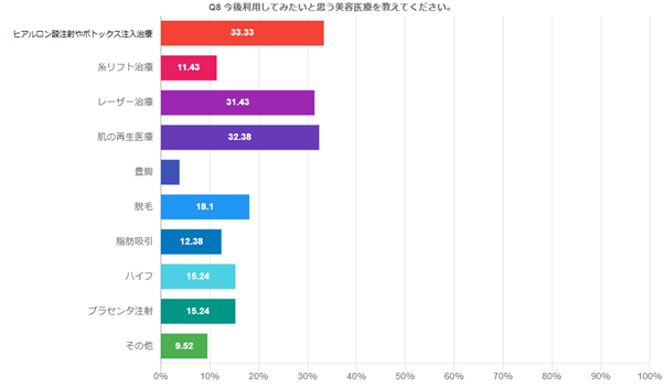 「Q8:今後利用してみたいと思う美容医療を教えてください。」(n=105)と質問したところ、「ヒアルロン酸注射やボトックス注入治療」33.33%、「糸リフト治療」11.43%、「レーザー治療」31.43%、「肌の再生医療」32.38%、「豊胸」3.81%、「脱毛」18.1%、「脂肪吸引」12.38%、「ハイフ」15.24%、「プラセンタ注射」15.24%、「その他」9.52%という回答となりました。