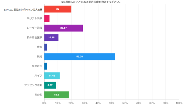 「Q6:利用したことのある美容医療を教えてください。」(n=105)と聞いたところ、「ヒアルロン酸注射やボトックス注入治療」20%、「糸リフト治療」3.81%、「レーザー治療」28.57%、「肌の再生医療」10.48%、「豊胸」1.9%、「脱毛」52.38%、「脂肪吸引」1.9%、「ハイフ」11.43%、「プラセンタ注射」8.57%、「その他」18.1%という回答となりました。
