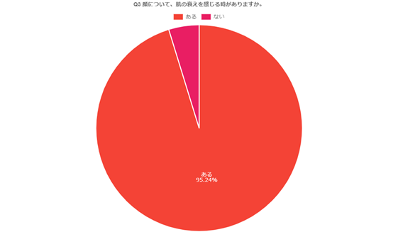 「Q3. 顔について、肌の衰えを感じる時がありますか。」(n=105)と質問したところ、「ある」95.24%、「ない」4.76%という回答となりました。