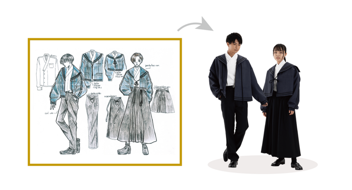 デザインのポイントは、和服と制服を組み合わせたときに違和感のないように、実際に人が着ることができるデザインになるように意識しました。⽇本らしさである和装で、現代らしく性別を問わないデザインを意識し、男⼦‧⼥⼦と明確に分けられたものではなく⾃分が着たい制服を選択できるようにという思いが込められています。(以下デザイン画とカタチになった作品)