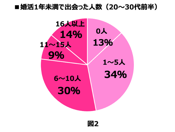 また、40代において婚活1年未満で、過半数以上の方が6人以上と出会えており、これは20代~30代前半の女性とほぼ同率になります。世間一般では年齢が上がるにつれて出会いが少くなると言われがちですが、実際のところはそのようなことはないようです。(図1,図2)
