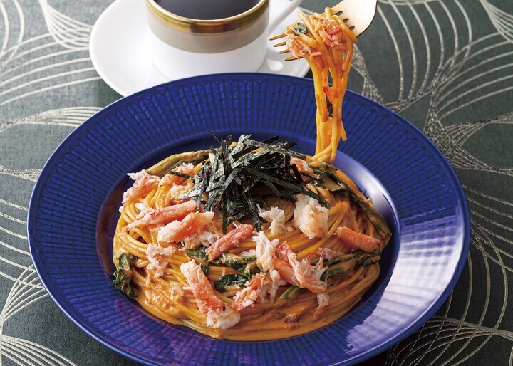 蟹や海老などの甲殻類と香味野菜をじっくり煮込み、その旨味を凝縮した「アメリケーヌソース」に、イタリア産トマトから作ったオリジナルトマトソースを加え、濃厚なコクと深い味わいに仕上げました。旬の食材“蟹”のほぐし身と、寒い時期が柔らかく美味しい“菜の花”を合わせた贅沢な味わいをお楽しみください。