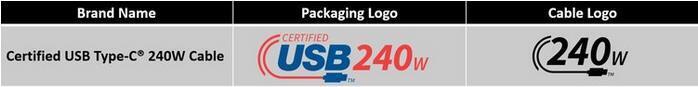 以下は240Wの給電をサポートする認定USB Type-Cケーブルの新しいロゴです。最新版のUSBロゴマーク一覧表はUSB-IF公式サイト(https://www.enablingusb.org/certification-japanese)よりご確認いただけます。