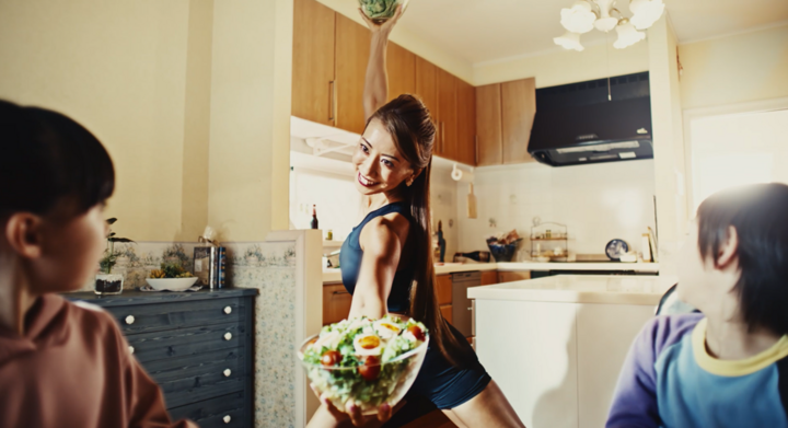美人・イケメンボディビルダー安井友梨と嶋田慶太が、“健康すぎる家族”としてTVCM出演。日常のシーンで究極の美ボディを披露!