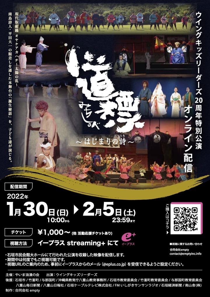 総勢65名、八重山の子どもたちによる舞台「道標〜はじまりの詩〜(みちしるべ・はじまりのうた)」が12月26日石垣市民会館大ホールにて上演された。その様子が、1月30日(日)から2月5日(土)まで、Streaming+にてオンライン配信される。