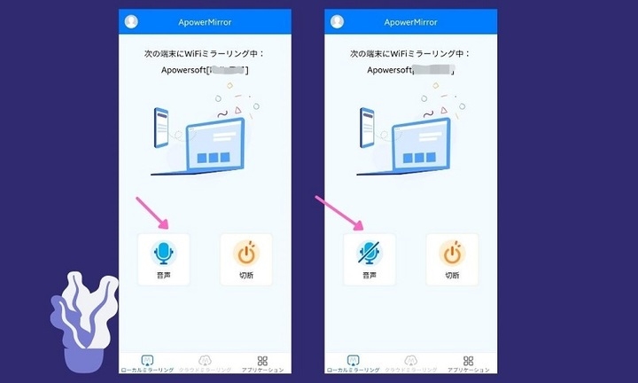 また、ミラーリング中にサウンドのミラーリングをオフにしたい場合は、音声ボタンをタップするだけで音声のオン/オフが可能です。