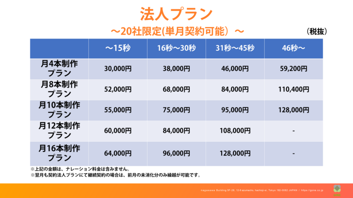 株式会社GONEはこの度、マーケティングに特化した動画をテンプレート化し、法人様20社限定で最安4,000円(税抜)〜