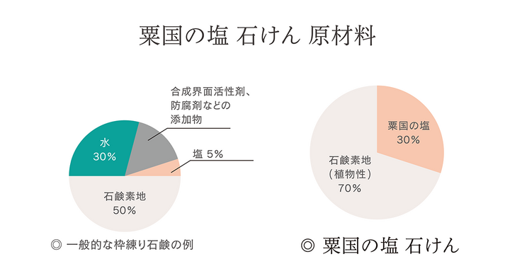 粟国の塩と高品質な植物油を原料とする石鹸素地、この二つの原料のみを“真空圧縮製法”で固形化した化学合成物質無添加の海塩石けんです。