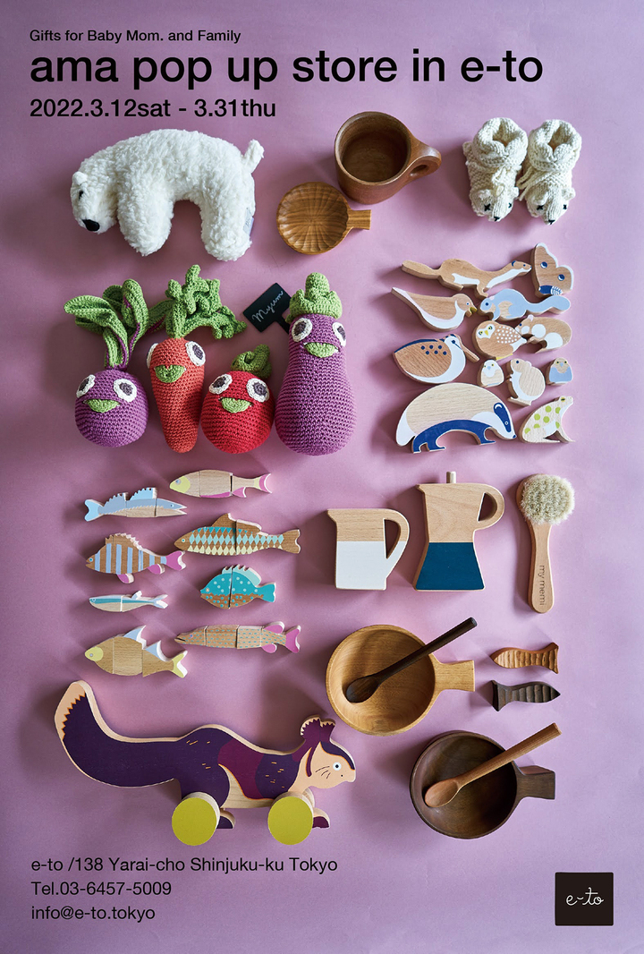 「心の奥に残るものを」をコンセプトとしたベビーギフト専門店ama(アマ)は、3月12日(土)〜3月31日(木)の期間限定で東京・奥神楽坂のホームメイドデリカッセン「e-to(イート)」にてポップアップストアを開催いたします。