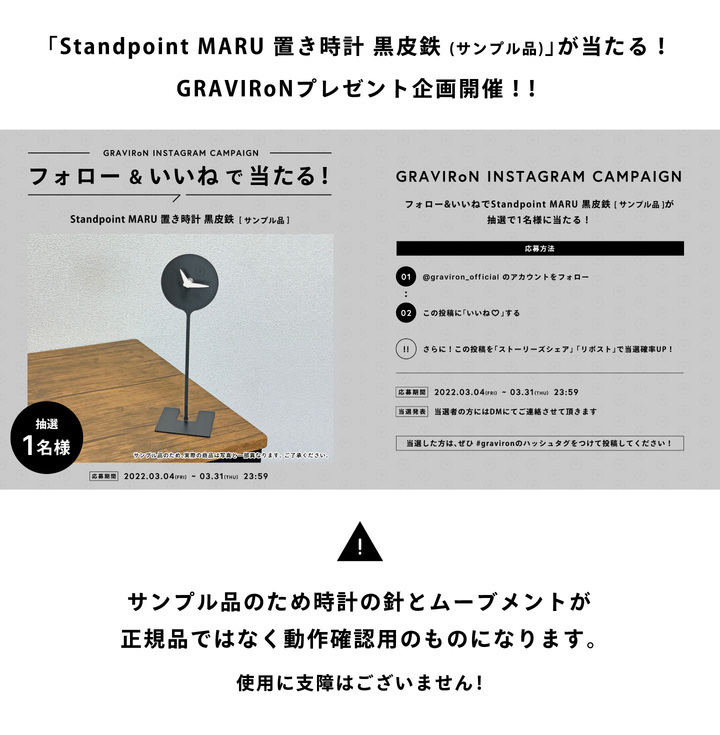 GRAVIRoN(グラビロン)の人気商品「Standpoint MARU 置き時計 黒皮鉄 [サンプル品]」が当たるプレゼントキャンペーン開催中!Instagramをフォロー&いいねするだけで、プレゼントしちゃいます。Standpoint MARU 置き時計 黒皮鉄 [サンプル品]はバス停をイメージした小型の置き時計。デスク周りや玄関先などに最適です!シンプルなデザインはどんな空間にもマッチすると好評!今回は製品開発時の見本品をアウトレット品としてプレゼントいたします!今月末まで受付しますので、皆様のご参加お待ちしております!
