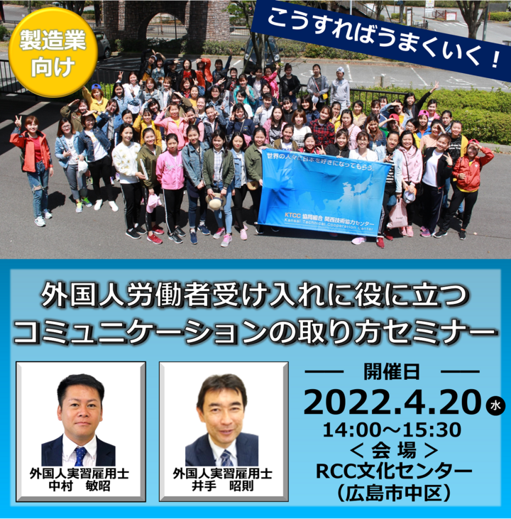 外国人技能実習生の受け入れ監理団体及び特定技能外国人の登録支援機関である協同組合関西技術協力センターは、2022年4月20日(水)にRCC文化センター(広島市中区)にて無料セミナーを開催します。セミナーは3部構成で、「外国人労働者を取り巻く環境」から、「外国人従業員との接し方のコツ」、「活用事例」等について学べるセミナーです。