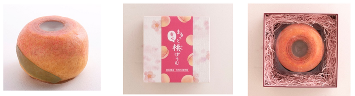 「まるっと幸せ桃ばうむ」は、ふわふわなバウムクーヘン生地と、白桃がしっかりと感じられるよう仕上げた桃のフルーツ羊羹を組合せた、あっさりと食べられる逸品。