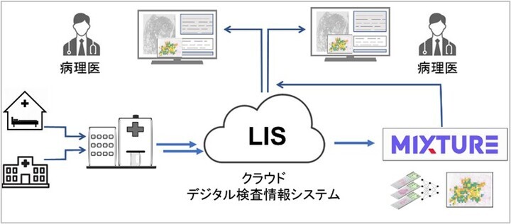 (図4)多くのクリニックや病院から提出される病理検体をデジタル化し、クラウド上でMIXTUREと連結。遠隔病理医により診断されるスキームのイメージ図