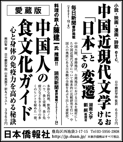 【広告出稿】日本僑報社の人気書籍『中国近現代文学における「日本」とその変遷』と『中国人の食文化ガイド―心と身体の免疫力を高める秘訣』、毎日新聞に紹介された