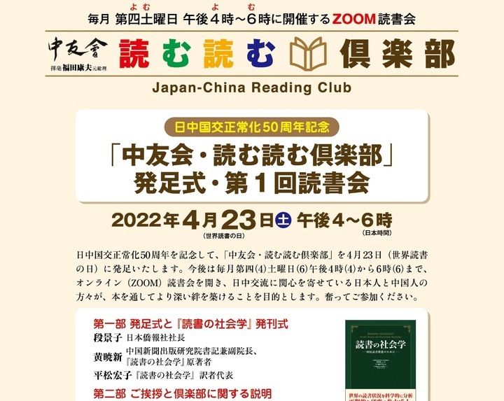 4月23日は世界読書デーである。日本僑報社が主催する記念イベントは、『読書の社会学』の原著者をはじめ、日本語版の訳者らを招待して、読書の意義・楽しさなどを語ってもらう予定。一般参加可能。詳細は同社のホームページをご留意ください。