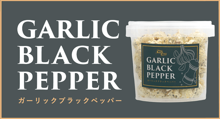 パンチのあるガーリックをベースにブラックペッパーでピリッとした辛さのアクセントを加えた、後引く旨味がクセになる、大人のおつまみポップコーン。