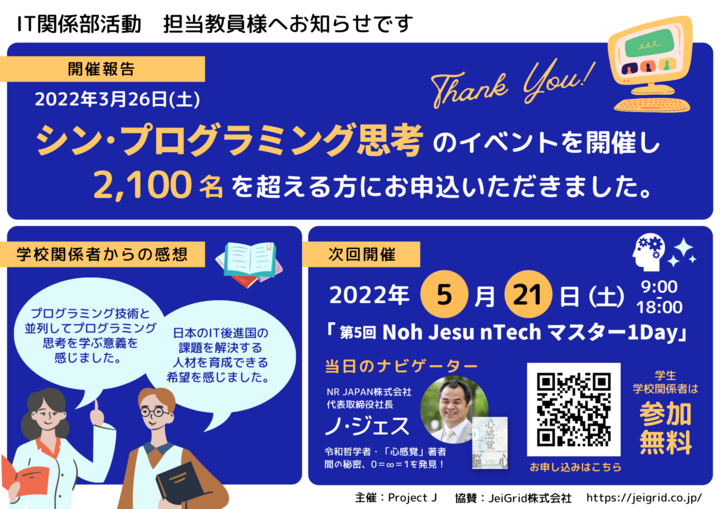 本教育は、IT後進国日本を、IT先進国へと転回させる未来技術とも言え、未来の産業を生み出す基盤となることでしょう。