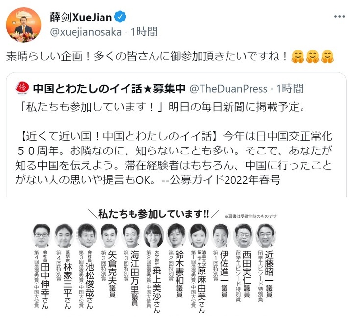 【日本僑報社発】薛剣・中華人民共和国駐大阪総領事は、4月15日午後1時半付けの自身のツイッターで、日本僑報社主催の「忘れられない中国滞在エピソード」募集活動のツイートを下記のように賞賛した上、リツイートした。