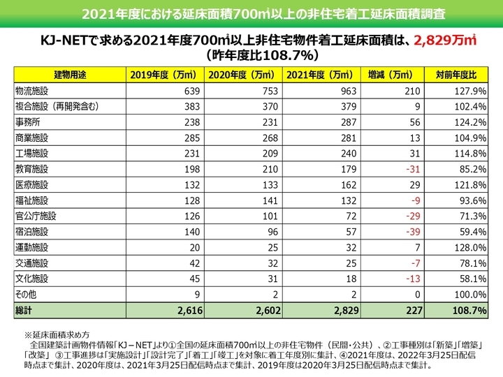 KJ-NET2022年3月配信時点での2021年度における延床面積700㎡以上の非住宅着工延床面積は、2,829万㎡となる。これは、昨年度の同時点(2021年3月配信時点)で比較すると227万㎡増(対前年度比108.7%)となる。新型コロナウイルス感染症の影響で工事の順延などはあるが、前年度と比較して増加している。