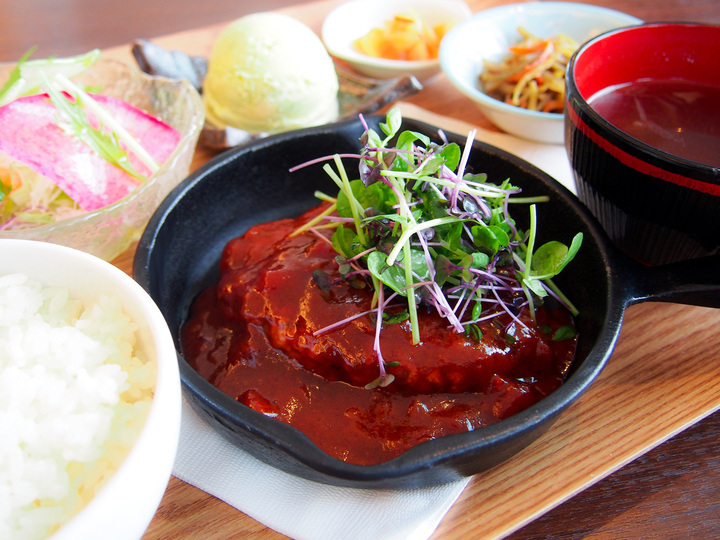 ハンバーグ。トマトベースのデミグラスソースには、クマイザサ粉末とオリゴノール
