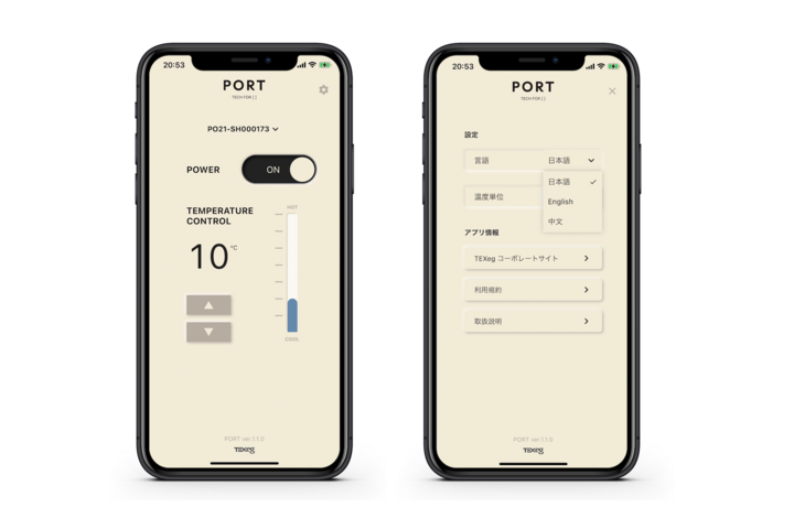 スマートフォンからPORTを操作できるアプリを開発しました。アプリからは、細かい温度設定や遠隔での操作が可能です。