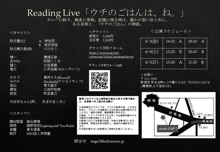 NPO法人声物園 Reading Live「ウチのごはんは、ね。」 2022年6月3日(金)~6月5日(日) STUDIO ZAP!(曙橋)