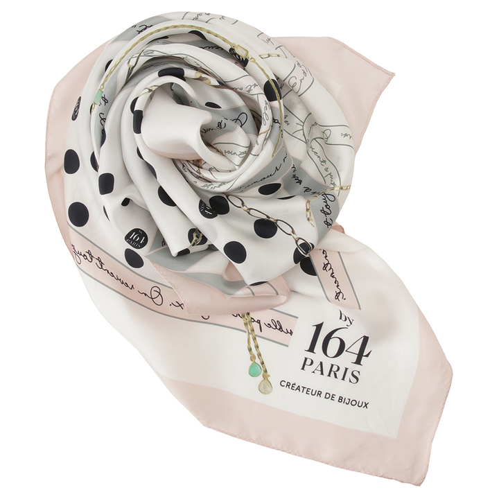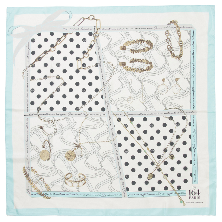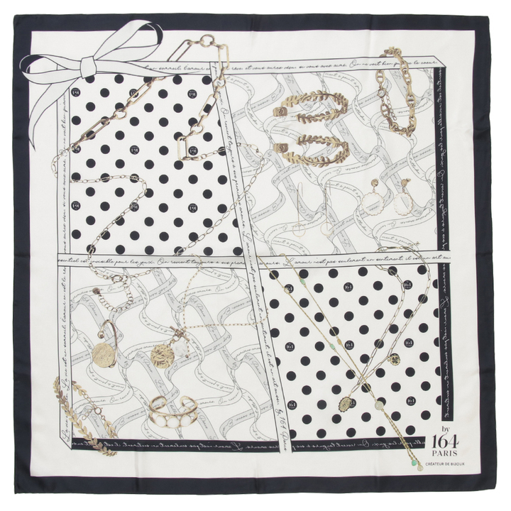 パリ、マドリードを拠点として、三人の女性デザイナーが送るジュエリーブランド「by164PARIS(バイ サン・スワサント・キャトル パリ)」。 【「パリからのレター」がコンセプト】 コーディネートまで考えて計算し、制作される「by164PARIS(バイ サン・スワサント・キャトル パリ)」のコレクション。 フランスの名言がリボンのデザインに散りばめられています。 スカーフLE RUBANは noir / roseの2色。LE BIJOUXはnoir / rose / turquoise の3色。ギフトBOX入り。シルク100% 日本製 サイズ:90cm x 90cm 各 ¥19,800(税込)chouchou はnoir/rose/marine 各5,830円。ギフトBOX入り。
